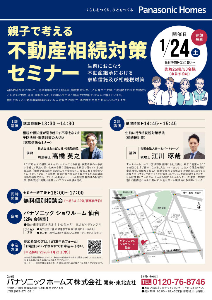 親子で考える 不動産相続対策セミナー 生前におこなう不動産継承における家族信託及び相続税対策 【講演内容】 超高齢者社会においてご自身やご夫婦、ご両親様の大切な財産を どのように管理・運用・承継するか。誰もが抱える不動産事業継承の お悩みの解決に向けて、専門家がお手伝いいたします。 (第1部) 相続や認知症が引き起こす不幸をなくす 予防法務・事前対策の大切さ 「家族信託セミナー」 講師: 株式会社あおばの杜 代表取締役/司法書士 高橋 英之 (第2部) 生前に行う相続税対策手法 「相続税対策」 講師: 税理士法人青木&パートナーズ 税理士 江川 琢哉 ■同時開催■ 無料個別相談会(要事前予約) 【日時】 ・セミナー 2026年1月24日(土) 第一部 13:30~14:30 第二部 14:45~15:45 ※受付時間 13:00~ ・無料個別相談会 16:00~17:00(セミナー終了